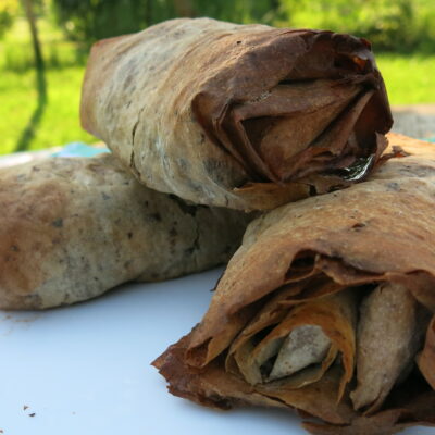 Kuvanu leblebiju i bananu samleti u blenderu, mlevenu masu prebaciti u veću posudu. Kašikom konstantno mešati i dodavati ostale sastojke osim čokolade. Nju istopiti na umereoj temperaturi. Sve sastojke jednako sjediniti i ručno formirati kuglice veličine oraha. Gotove kuglice složiti na tanjir i svaku preliti istopljenom čokoladom. Servirati hladno.